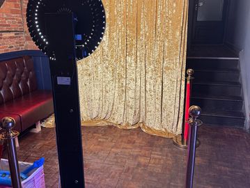 Photo Booth Area - Selfie Pod, Gold Posts, Red Velvet Rope, Props, Backdrop to elevate photos